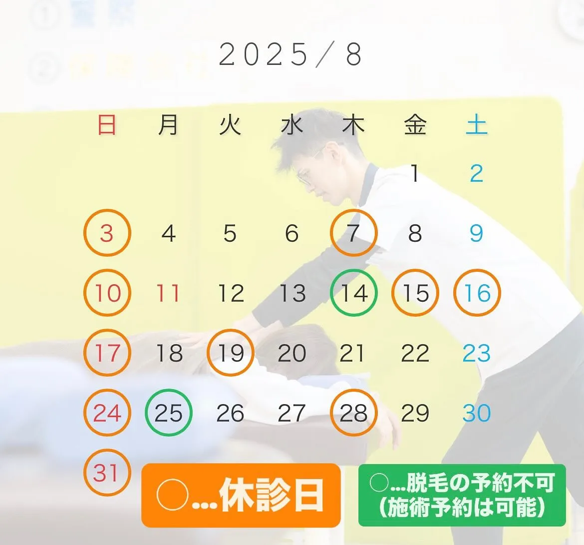 夏の暑さから身体がバテて疲労が溜まりやすい時期です‼️そんな夏は疲労、身体の痛みともにしっかりと診させていただきますので今月もぜひご来院下さい♪